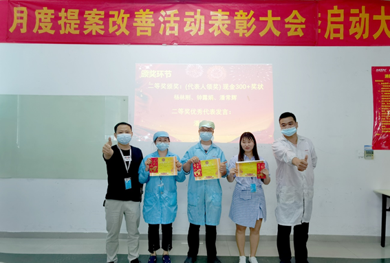 2月份,共收到员工提出141项提案,经各评审小组审核评选,最终角逐出一等奖1名,二等奖3名,三等奖6名,评审小组成员分别为优秀提案改善项目人员颁发荣誉证书、奖金,并合影留念。