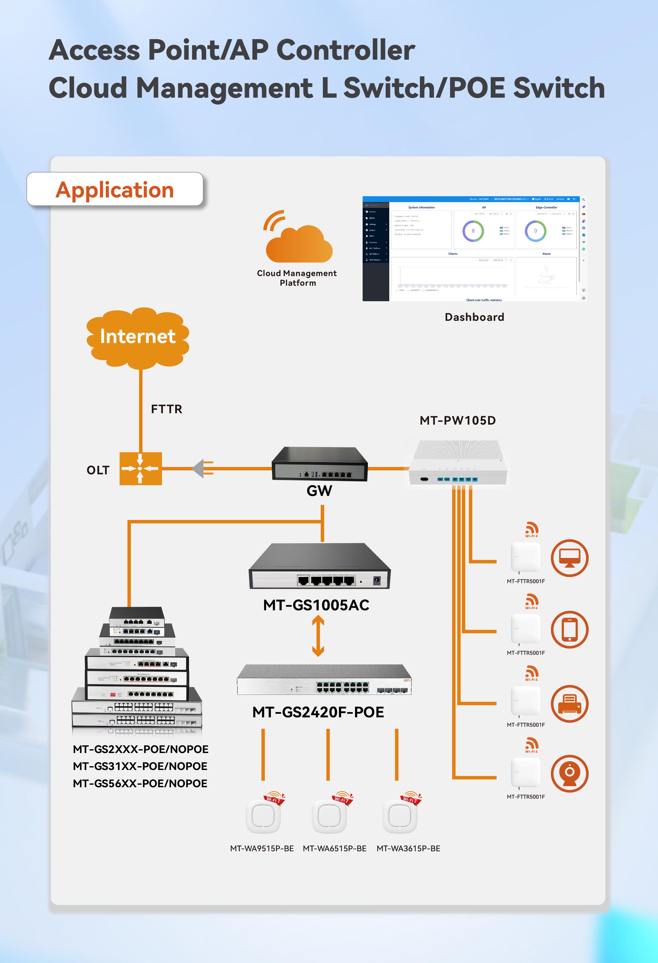 具备高性能的数据交换能力,支持多端口连接,能有效提升网络的传输效率和稳定性;支持云管理平台,实现对设备的远程监控、配置管理、故障诊断和软件升级,大大提高了管理效率。