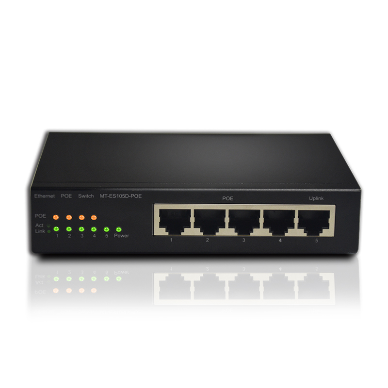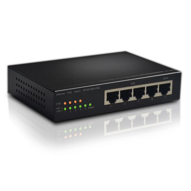 MT-ES105D-POE桌面交换机是一款全新设计的5口非网管型POE交换机,提供1个独立的uplink口,且1~4口支持IEEE802.3AF/AT标准,适用于监控工程和网络工程,可以为无线AP、IP摄像机等设备供电,即插即用,提供了低费用和高性能的网络解决方案。